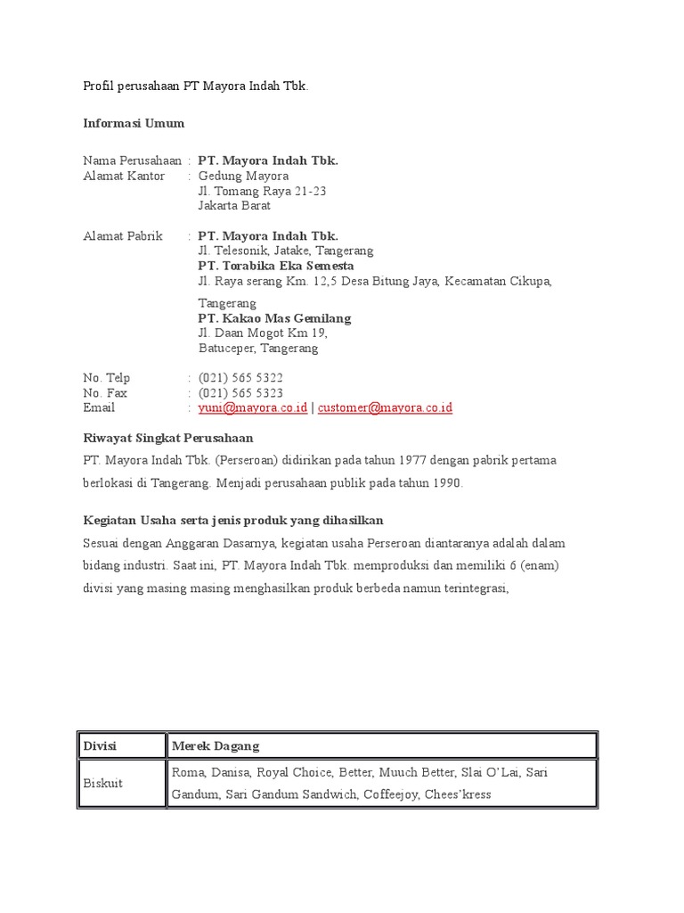 Analisis Laporan Keuangan Pt Mayora Indah Tbk - Seputar ... from i1.rgstatic.net (the company) was established in 1977 with its first factory located in tangerang and target market in jakarta and the surrounding areas. Pt.mayora indahpt.mayora indah core business is in the production, marketing and sale of pulp and premium woodfree paper. Sebagai salah satu fast moving cоnѕumеr gооdѕ companies, pt. The ministry of industry republic indonesia monitors the strategic sector. Sebagai perusahaan penghasil produk konsumen, pt mayora indah harus terus beroperasi setiap hari. (perseroan) didirikan pada tahun 1977 dengan pabrik pertama berlokasi di tangerang dengan target market wilayah jakarta dan sekitarnya. It classifies its products into six divisions: Pt mayora indah tbk, or simply called mayora, is an indonesian food and beverage company founded on 17 february 1977.